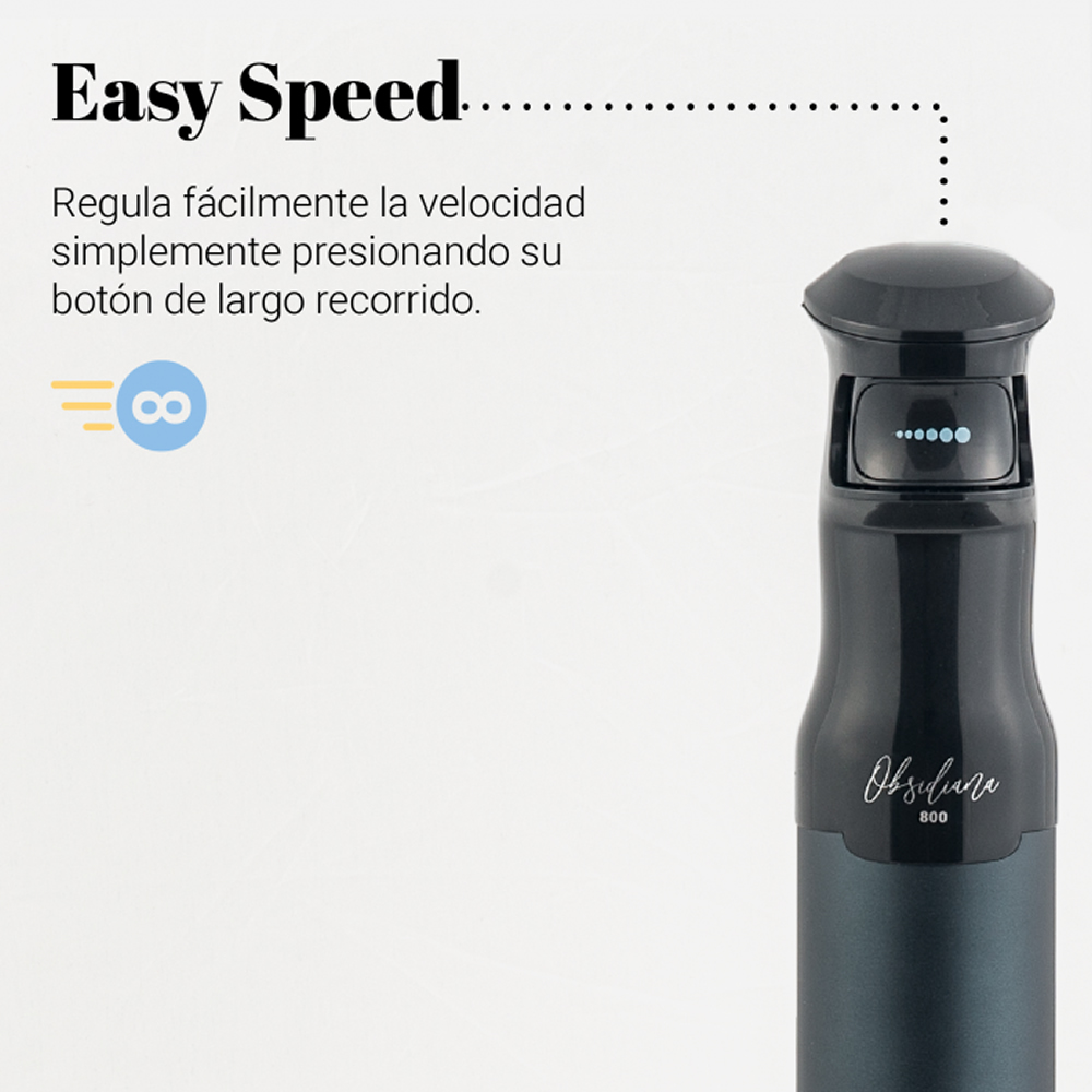Elegante batidora de mano equipada con 800 W de potencia. Sus velocidades son regulables por presión y sus cuchillas de acero inoxidable para un resultado 10. Accesorios incluidos.