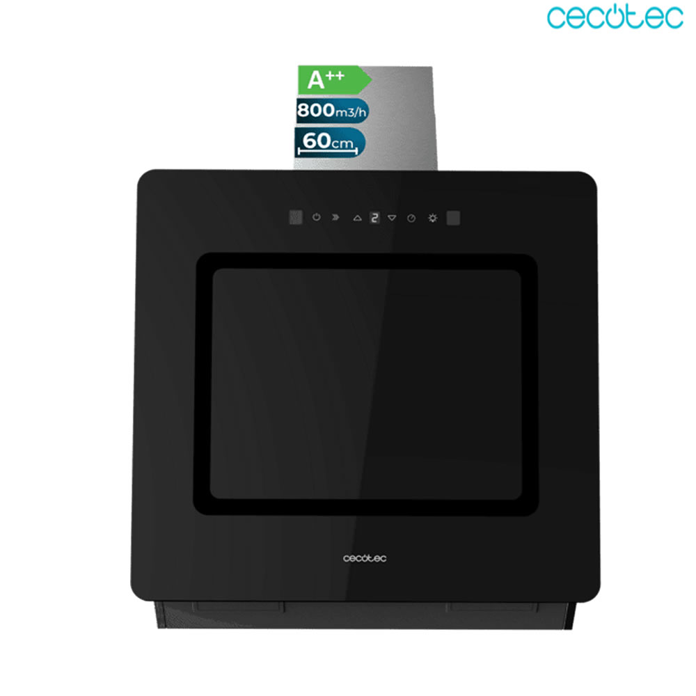 Bolero Flux DT 608002 Glass Black A++ Campana decorativa de 60cm de ancho, acabado frontal vidrio negro, chimenea inox, succión 800m3/h, Motor 210W, Clase A++, control táctil, 3 niveles de potencia, Booster, luz, filtro de carbono, Hand Movement Control y Delay Function.