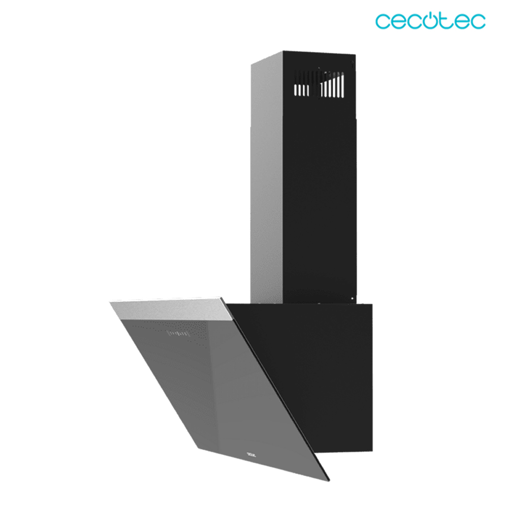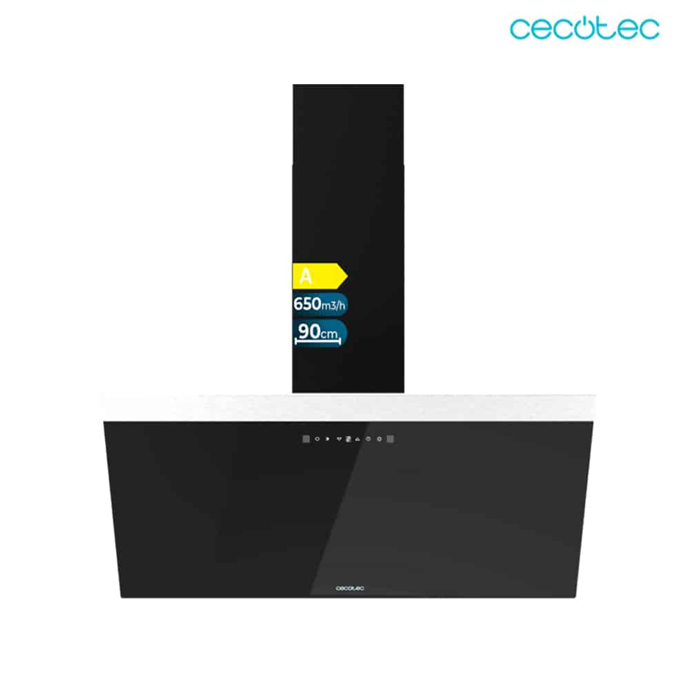 Bolero Flux DT 906500 Glass Black A Campana decorativa de 90cm de ancho, acabado frontal vidrio negro, chimenea negra, succión 650m3/h, Motor 165W, Clase A, control táctil, 3 niveles de potencia, Booster, luz, filtro de carbono y Hand Movement Control.