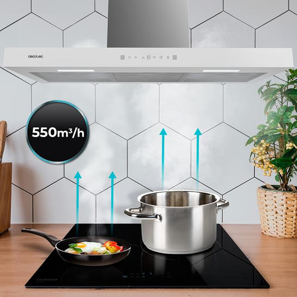 Flux TT 905500 Glass White A++ Campana T de 90cm de ancho, acabado frontal cristal blanco, succión 550m3/h, Motor 70W, Clase A++, control táctil, 3 niveles de potencia, luz, filtro de carbono, Hand Movement Control y Delay Function.