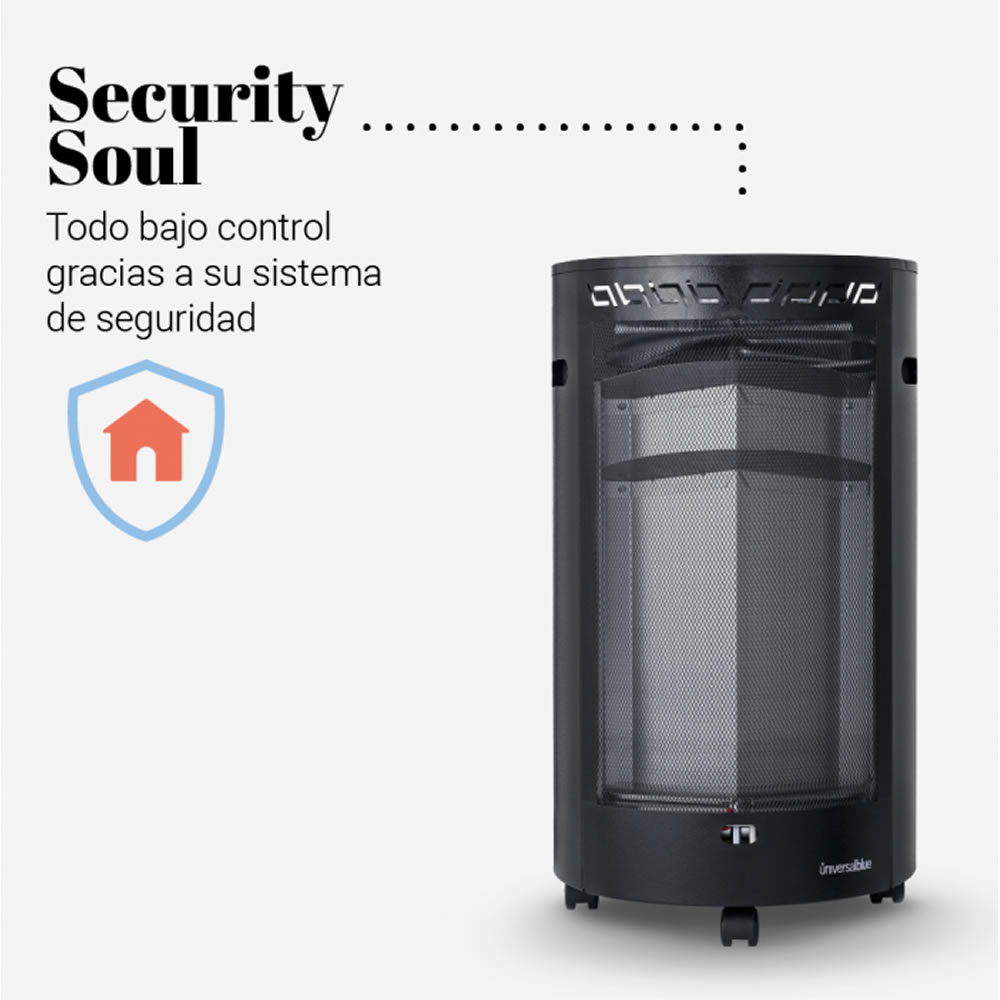 Su diseño circular sin ángulos cortantes en color negro y su cuerpo robusto en acero inoxidable, aportará ese toque arraigado y con personalidad a tu hogar. Además, incorpora un sistema de detección de oxígeno y protección de seguridad por fallo de la llama, por lo que resulta firme y segura.