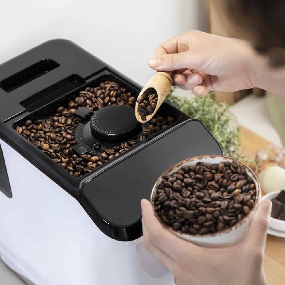 La cafetera cuenta con un depósito hermético de 200 g para conservar todo el aroma de cada grano de café. Además, cuenta con un molinillo integrado para que puedas elegir el nivel de molienda y extraerlo para su limpieza.