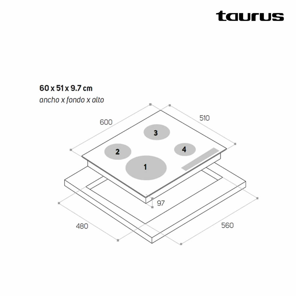 Placa de gas de 60 x 51 cm. CG4HN/B es una placa de cocina de gas, con cristal negro templado, preparada tanto para gas natural como gas butano. Cuenta con cuatro fogones de gas.