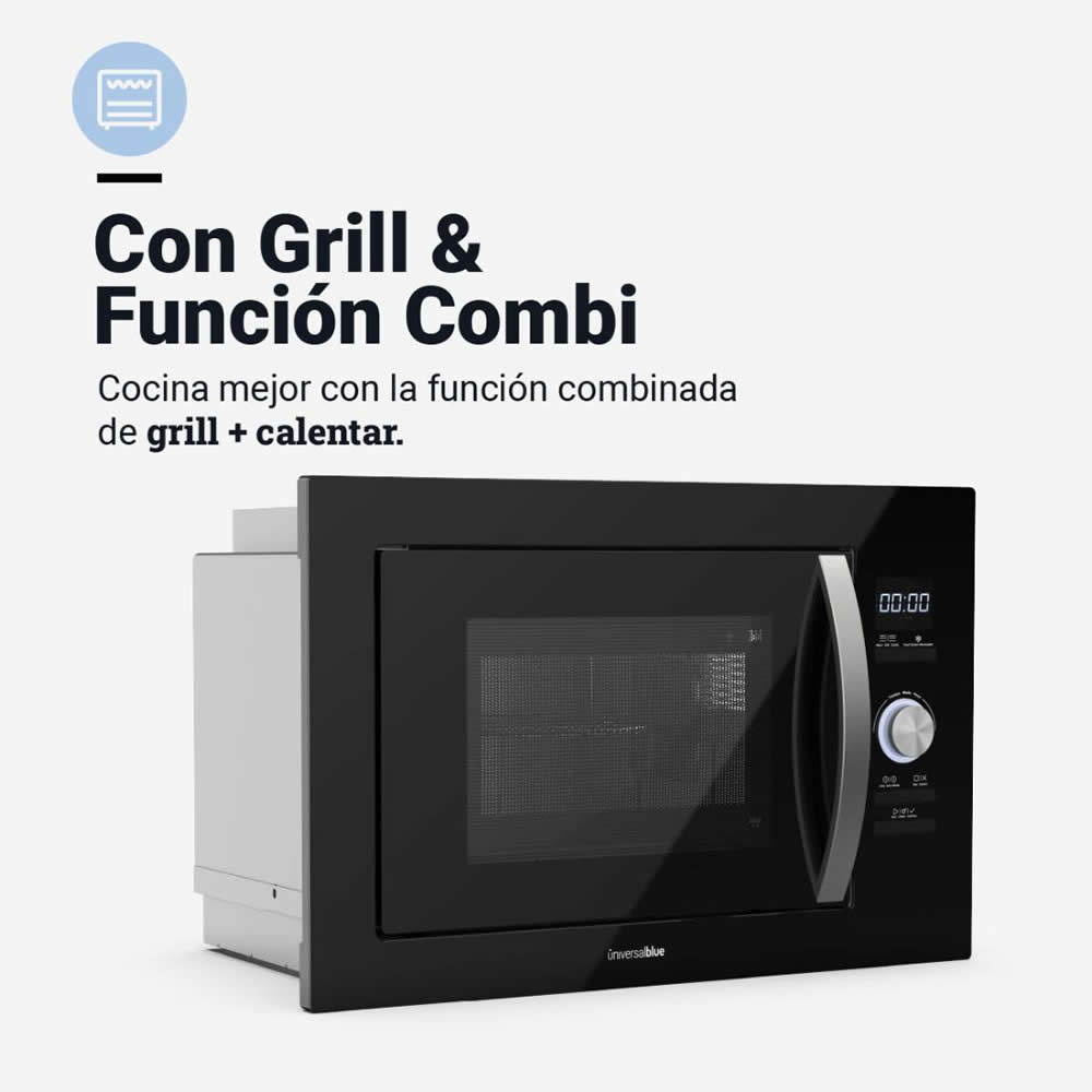 Equipado con 900 W y 1000 W de potencia en su función grill. Elige entre sus 5 modos de potencia y selecciona el tiempo de cocción cómodamente con su control electrónico, incluye temporizador hasta 95 minutos. Su función descongelar, te permimtirá descongelar desde carnes y pescados hasta platos preparados sin necesidad de sacarlos la noche anterior. Y su señal sonora te indicará que tus platos están listos para tomar. Revisa el estado de tus recetas gracias a su luz interior.