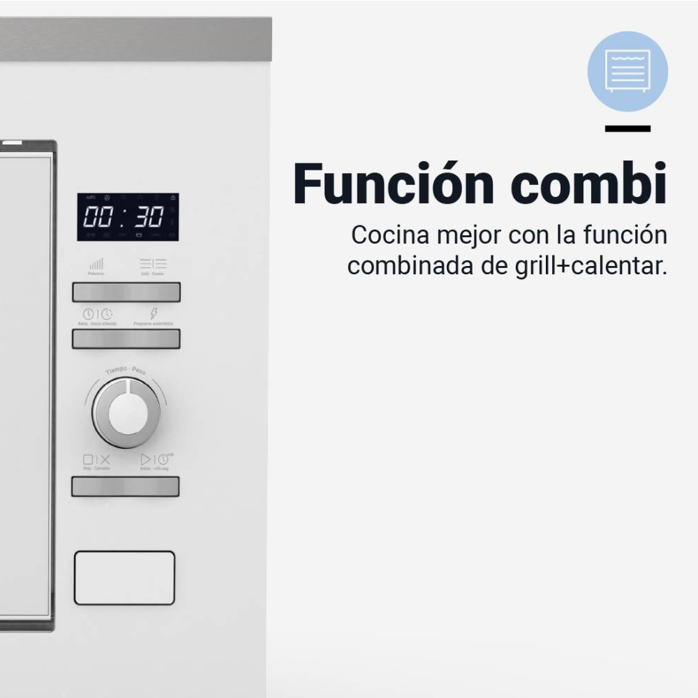 Microondas de encastre con capacidad de 20 litros y 9 funciones. Equipado con grill (900 W de potencia), temporizador de hasta 95 minutos y control digital. Incluye bloqueo infantil.