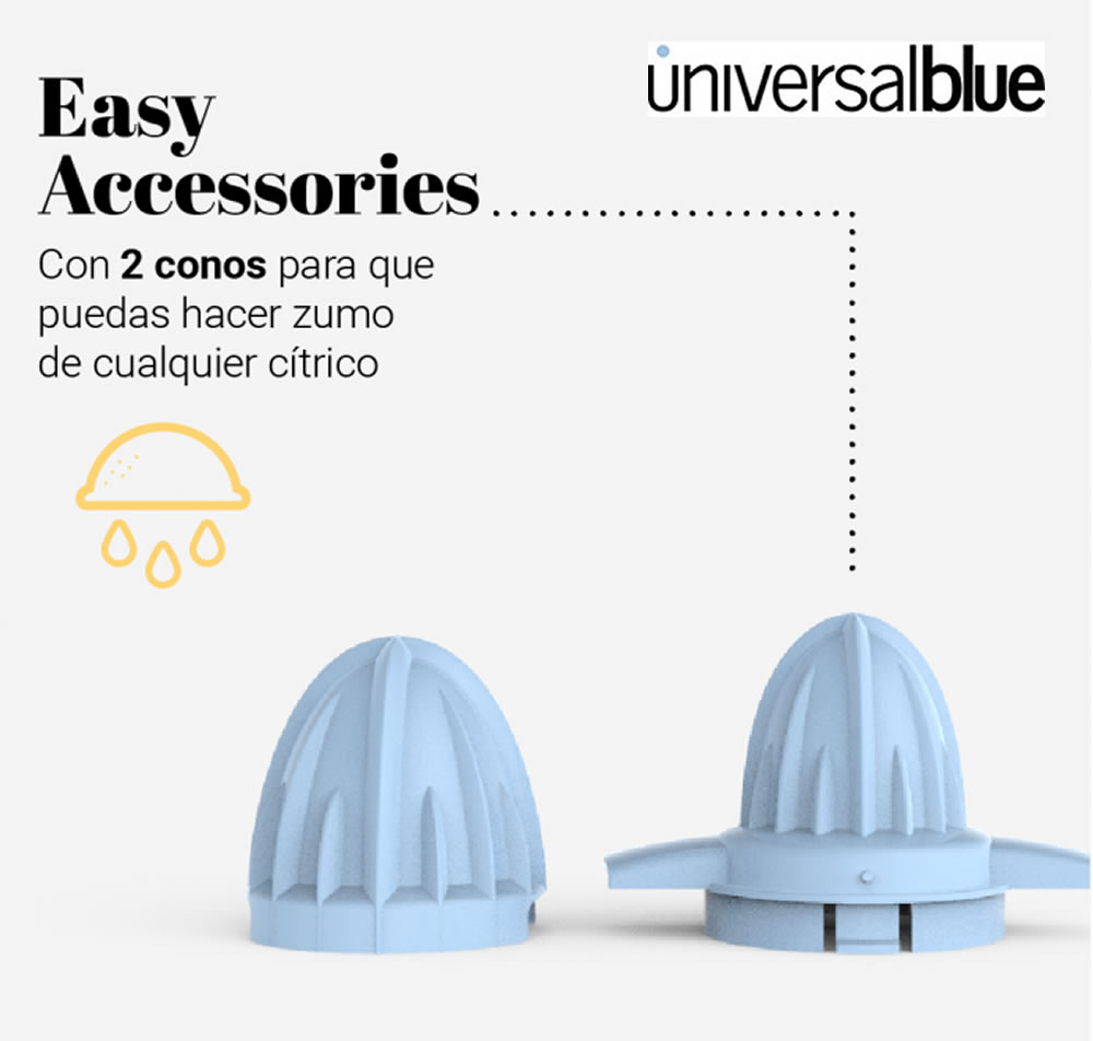 Un equilibrio perfecto entre diseño y tecnología que decorará tu cocina. Con su giro en doble sentido y sus filtros ajustables, no perderás ni una gota de tus frutas favoritas. Además, podrás seleccionar entre sus 2 conos el más adecuado, porque no todos los cítricos son del mismo tamaño.