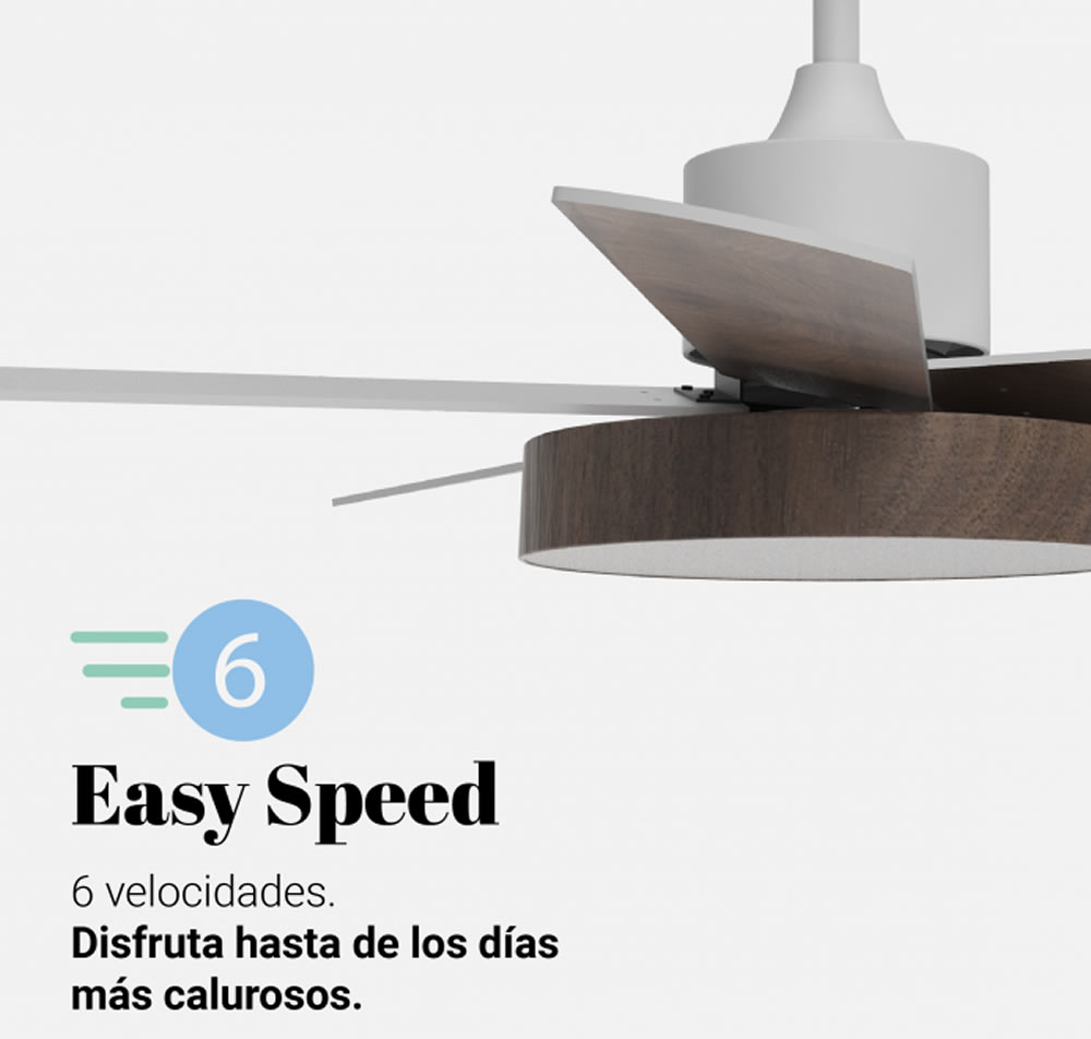 ¿Conoces el ventilador de techo con Motor DC? Se trata de un ventilador de techo silencioso, con el que no escucharás ni la brisa, pero sí, disfrutarás de la misma. Sabemos que no todos los días son iguales, por ello, podrás seleccionar entre sus 6 velocidades aquella que más te satisfaga (manteniendo siempre el silencio que tanto nos gusta, pus la velocidad del ventilador es de 210 rpm).