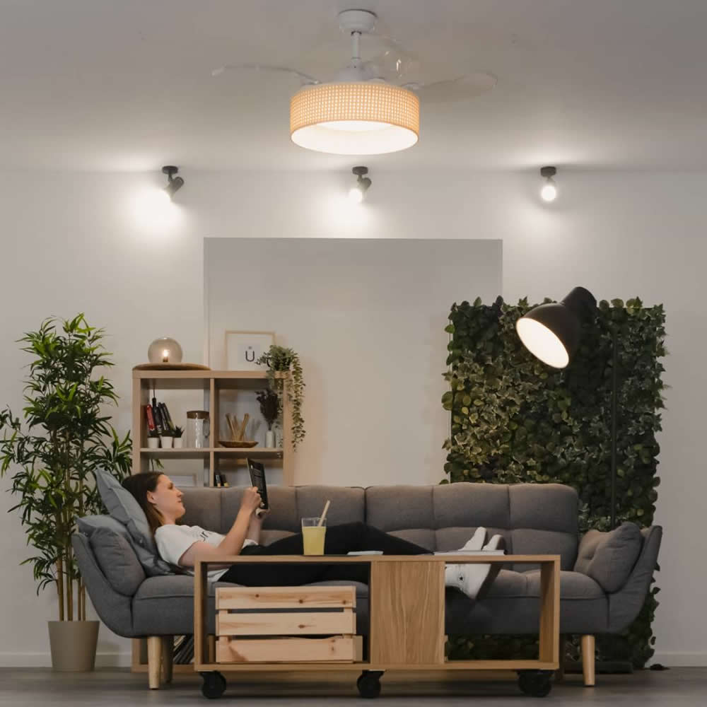 Ventilador de techo con aspas ocultas de 104 cm. Totalmente silencioso gracias a su motor DC, elige entre sus 6 velocidades y 3 tipos de luz. Diseño con tulipa de ratán y 4 aspas translúcidas ocultables.