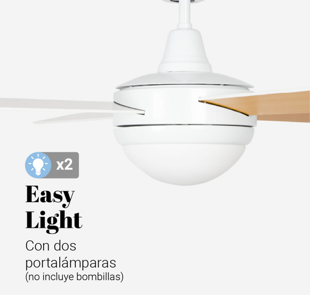 Equipado con aspas reversibles, nuestro ventilador de techo marrón claro te permitirá crear la unión perfecta con el resto de elementos de la estancia o incluso, cambiar la decoración cuando quieras dar un toque diferente a tu hogar, pues sus aspas de MDF están disponibles en acabado de madera haya o color blanco, cuál es tu combinación favorita?